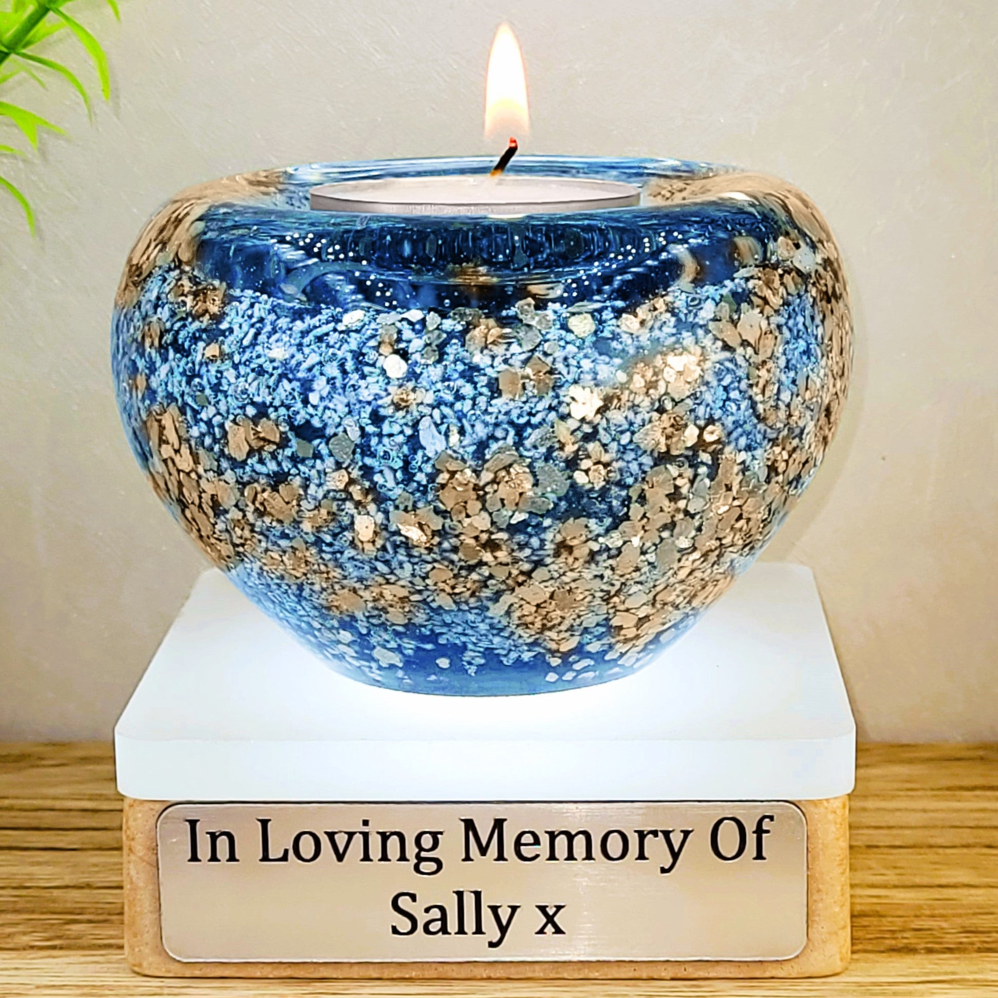 This handmade glass candle holder features a stunning gold flake design, adding elegance and warmth to any space.