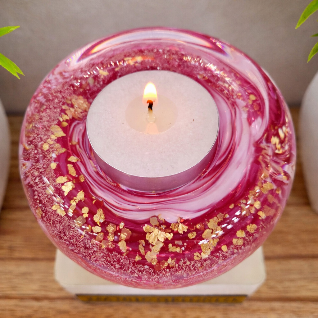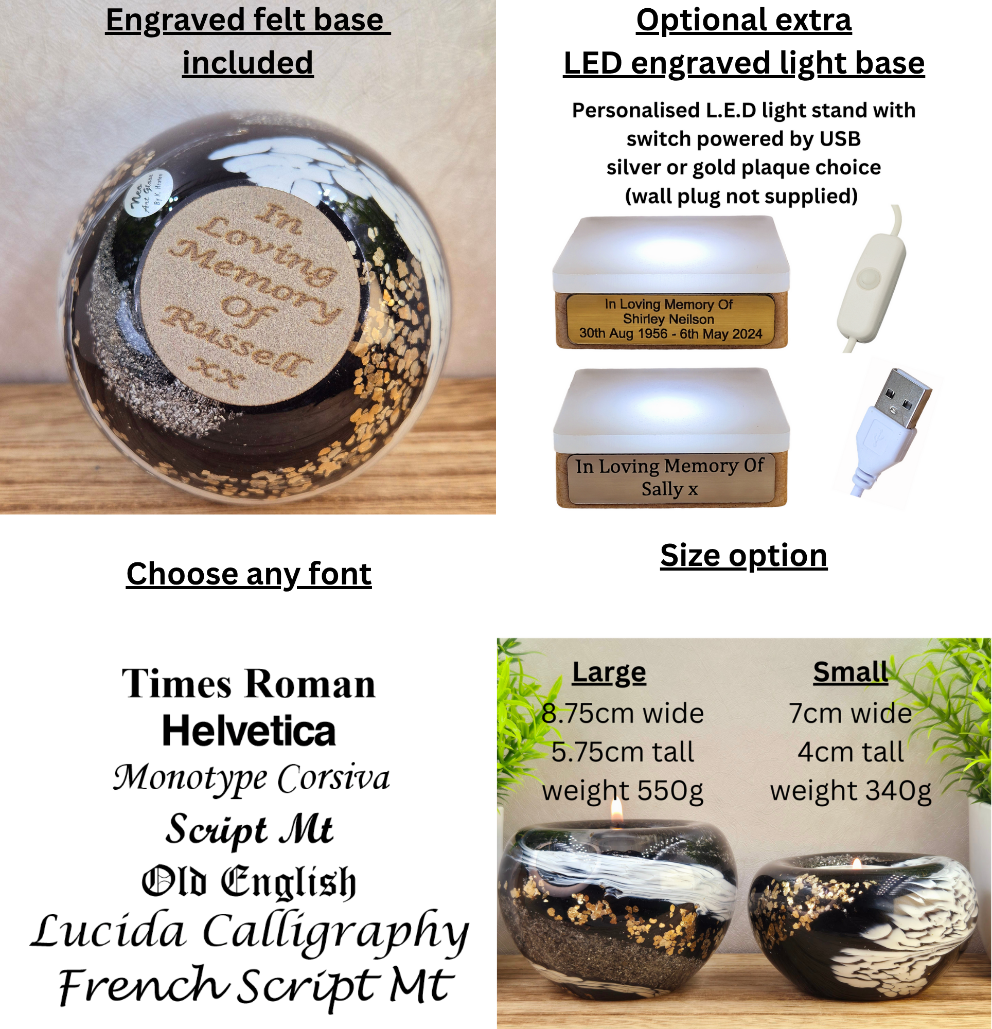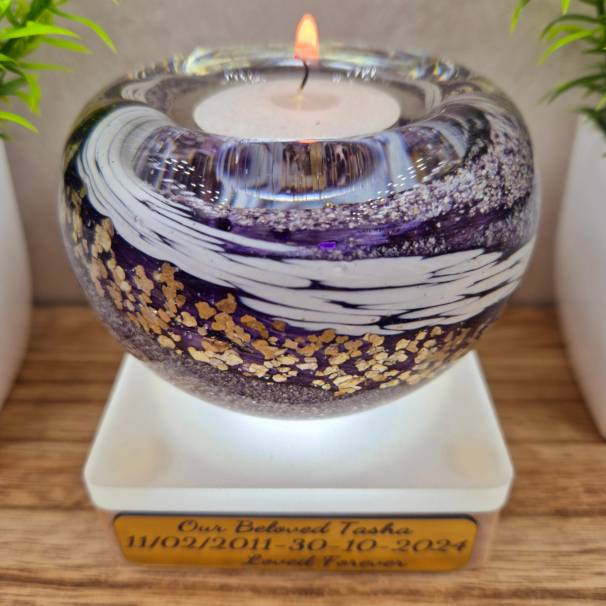 Keep the memory of a loved one close with this handmade glass memorial candle holder, carefully crafted to set the ashes within.