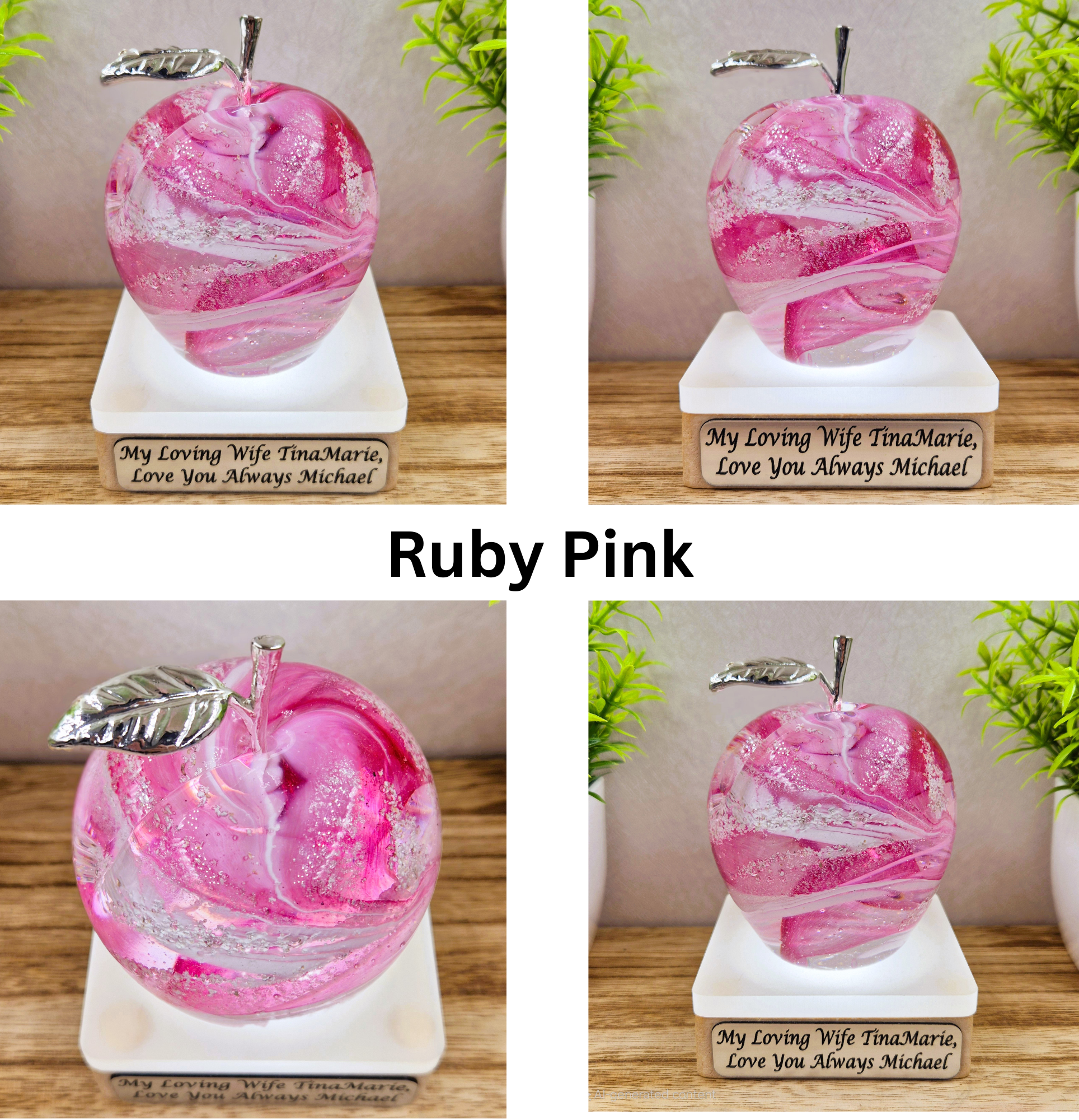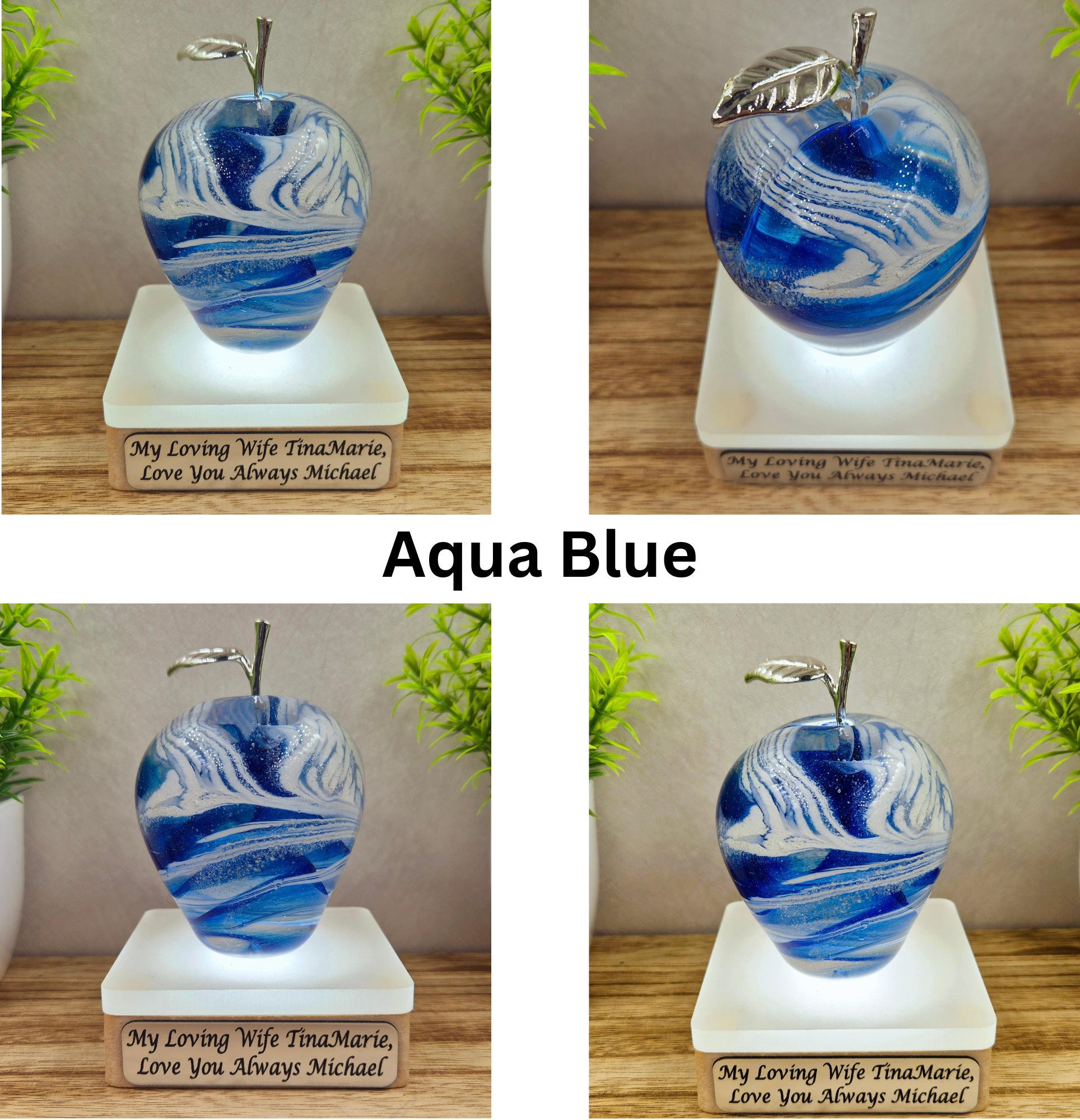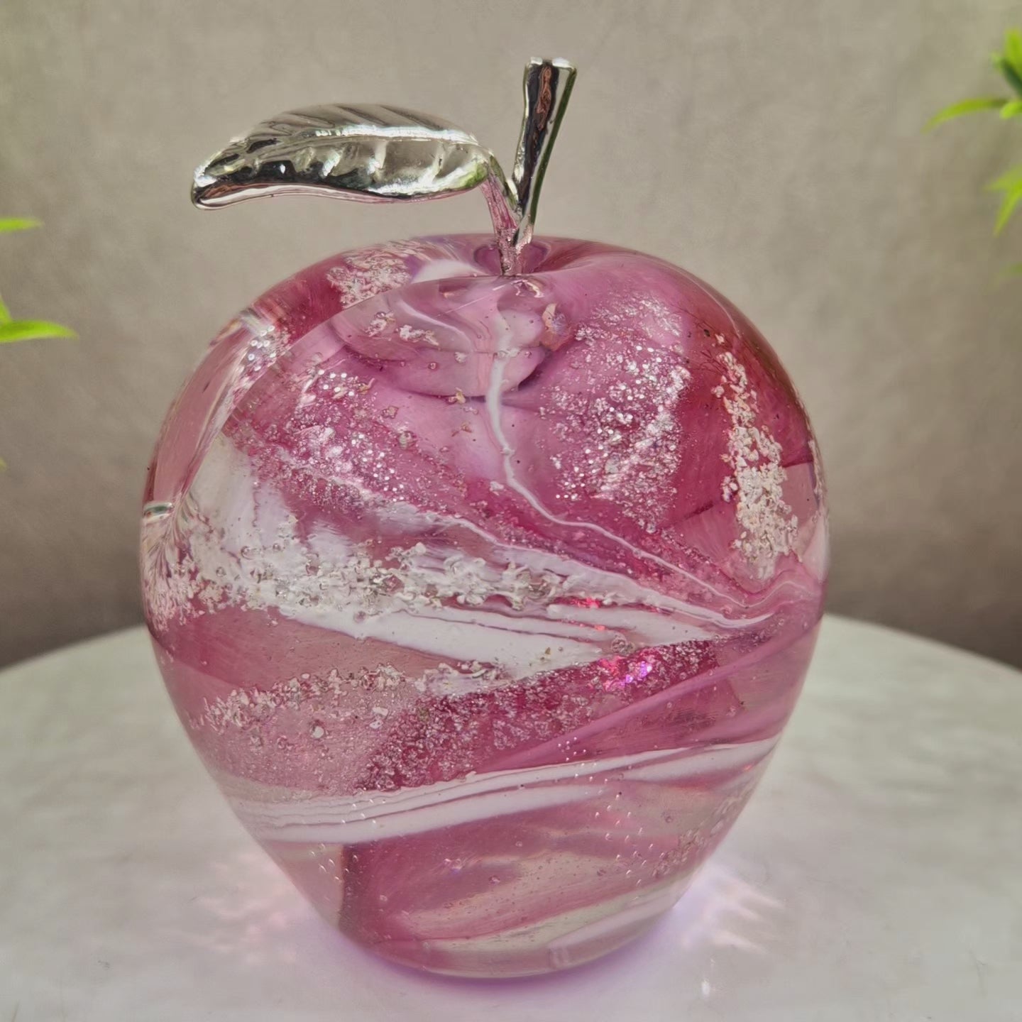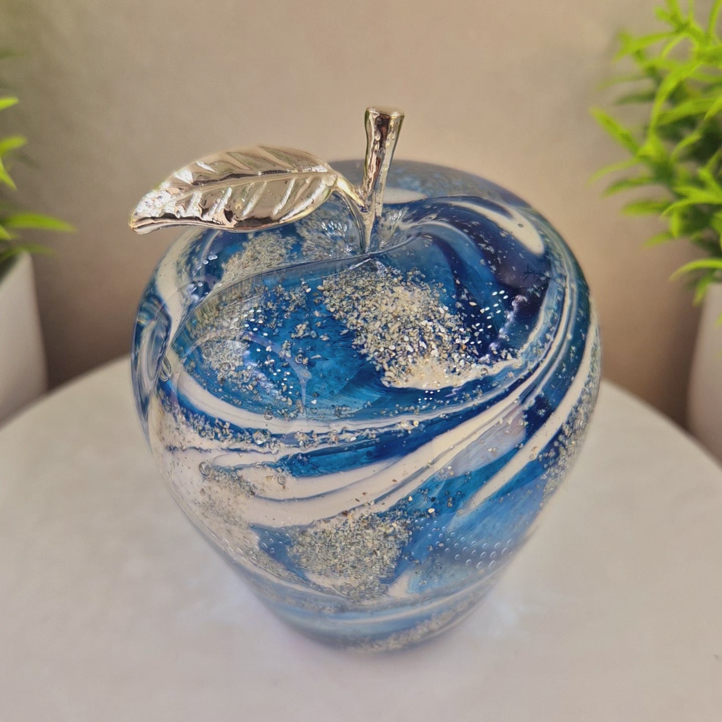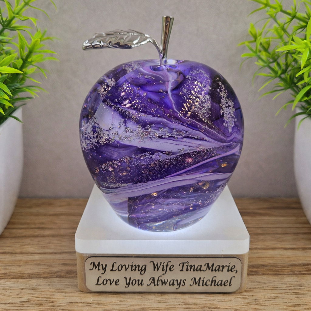 This handmade glass apple is a unique cremation ashes memorial, carefully crafted to hold the ashes of a loved one or pet. The elegant design creates a timeless tribute, reflecting light beautifully.