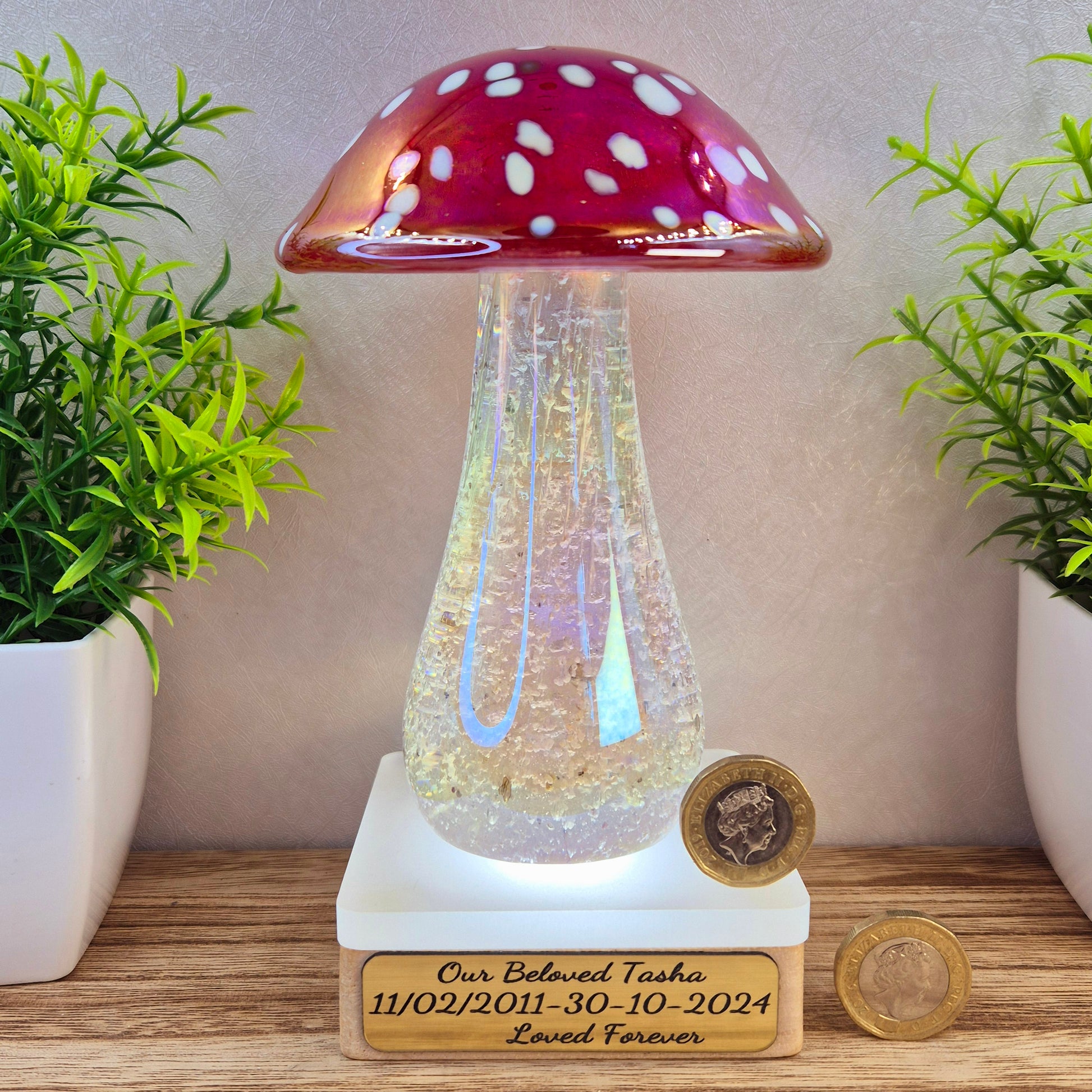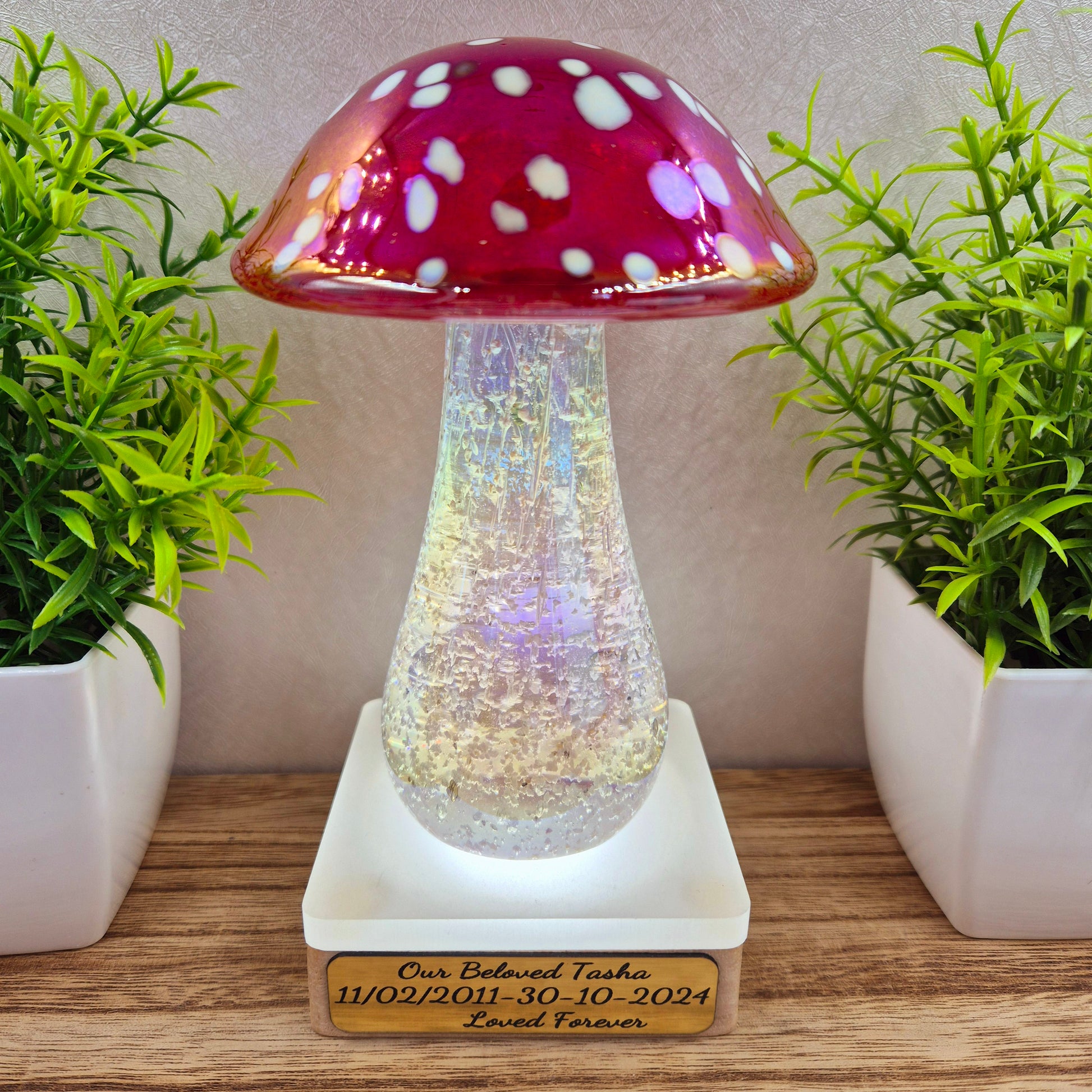 This handcrafted glass mushroom ornament holds cremation ashes, creating a stunning memorial keepsake for a loved one or pet. The iridescent glaze enhances its beauty, reflecting light in a delicate tribute.