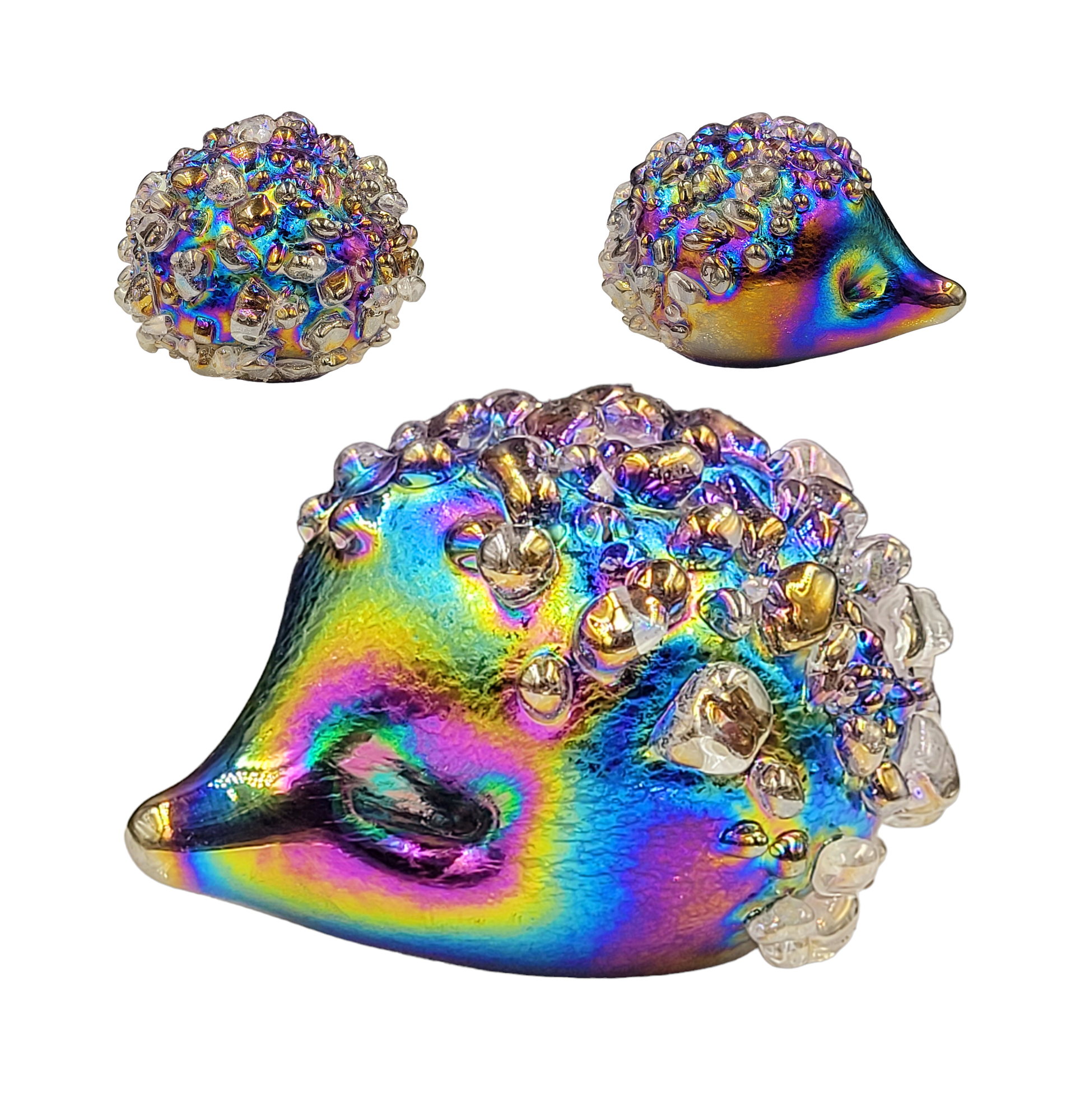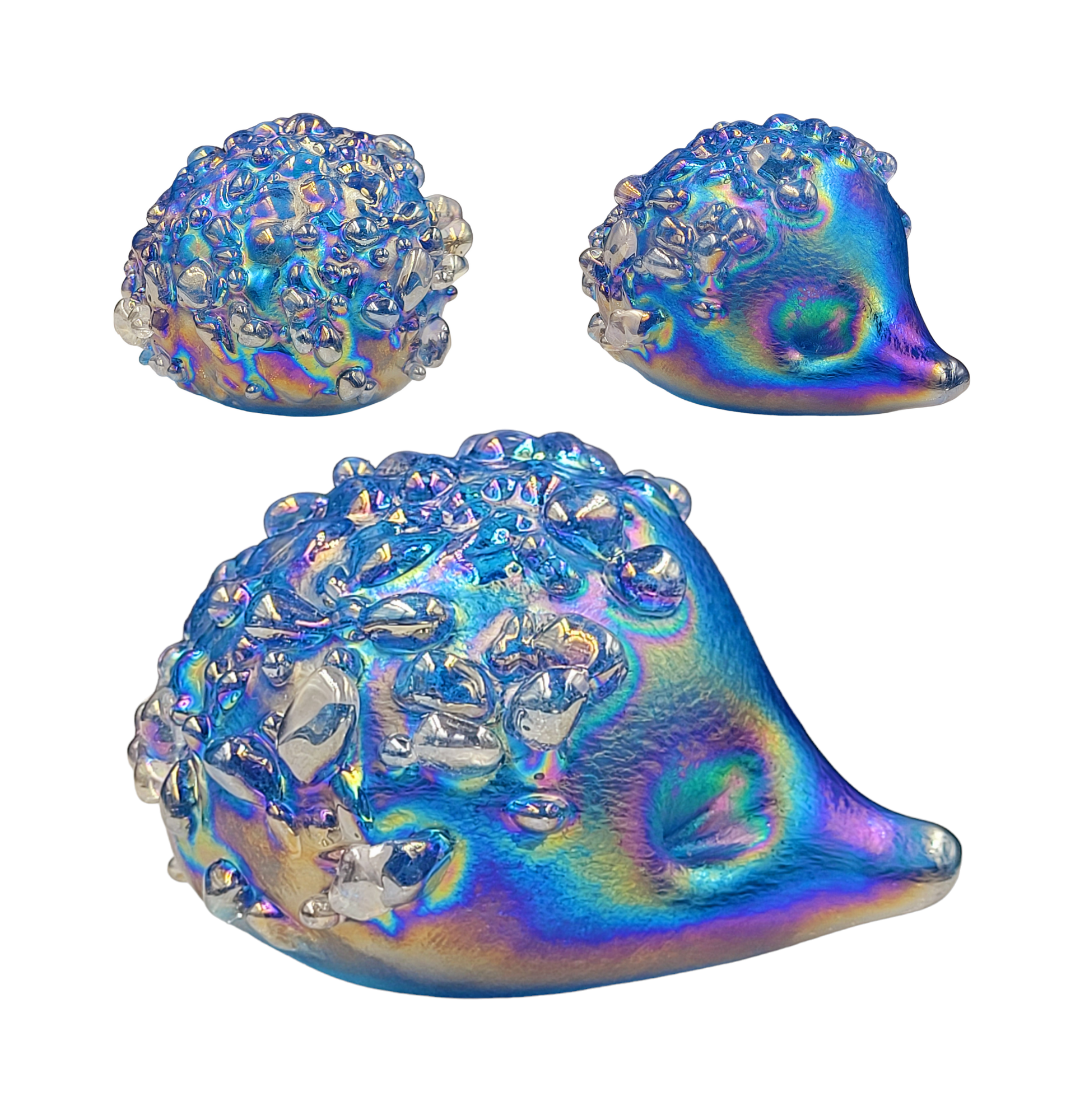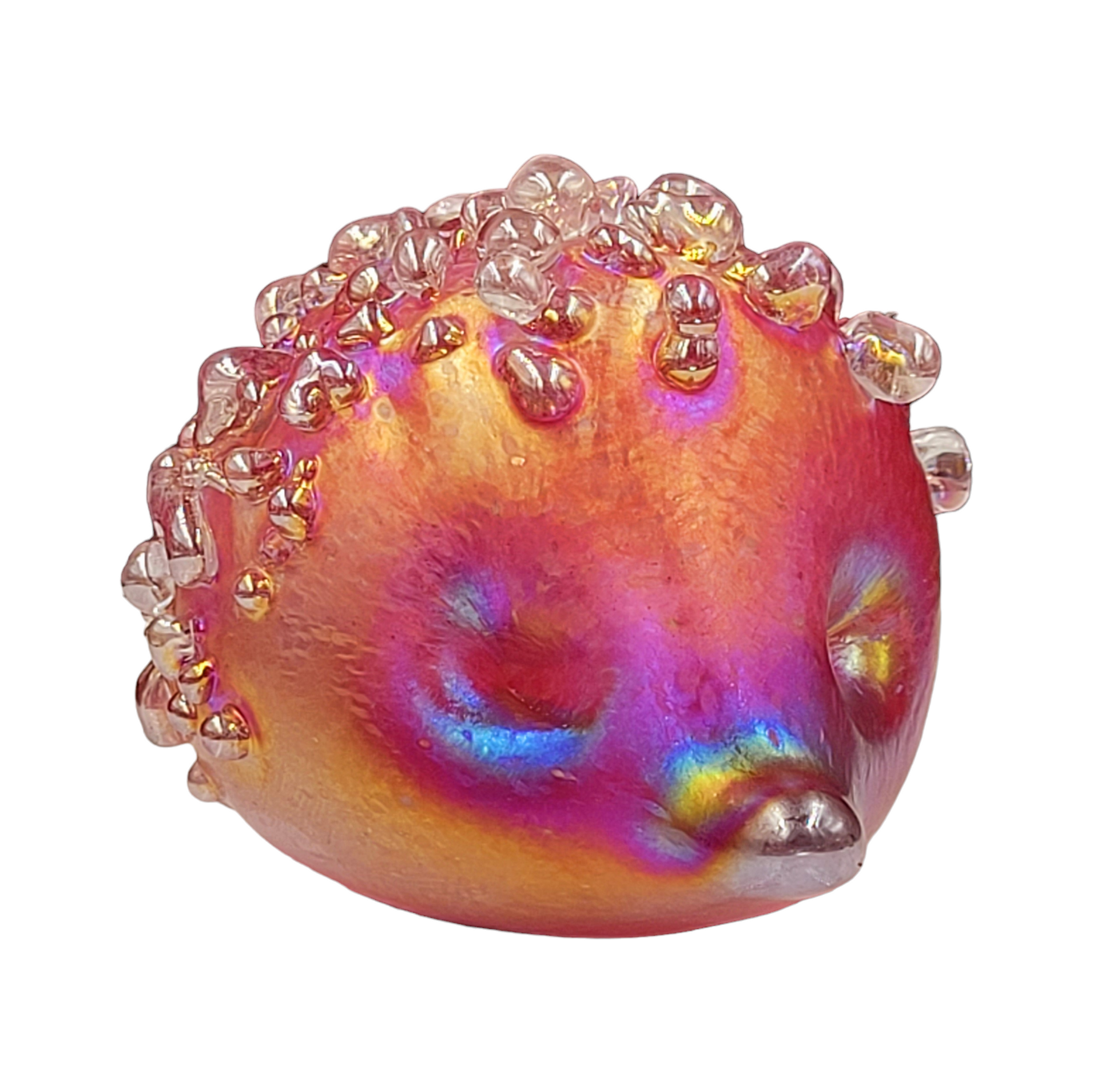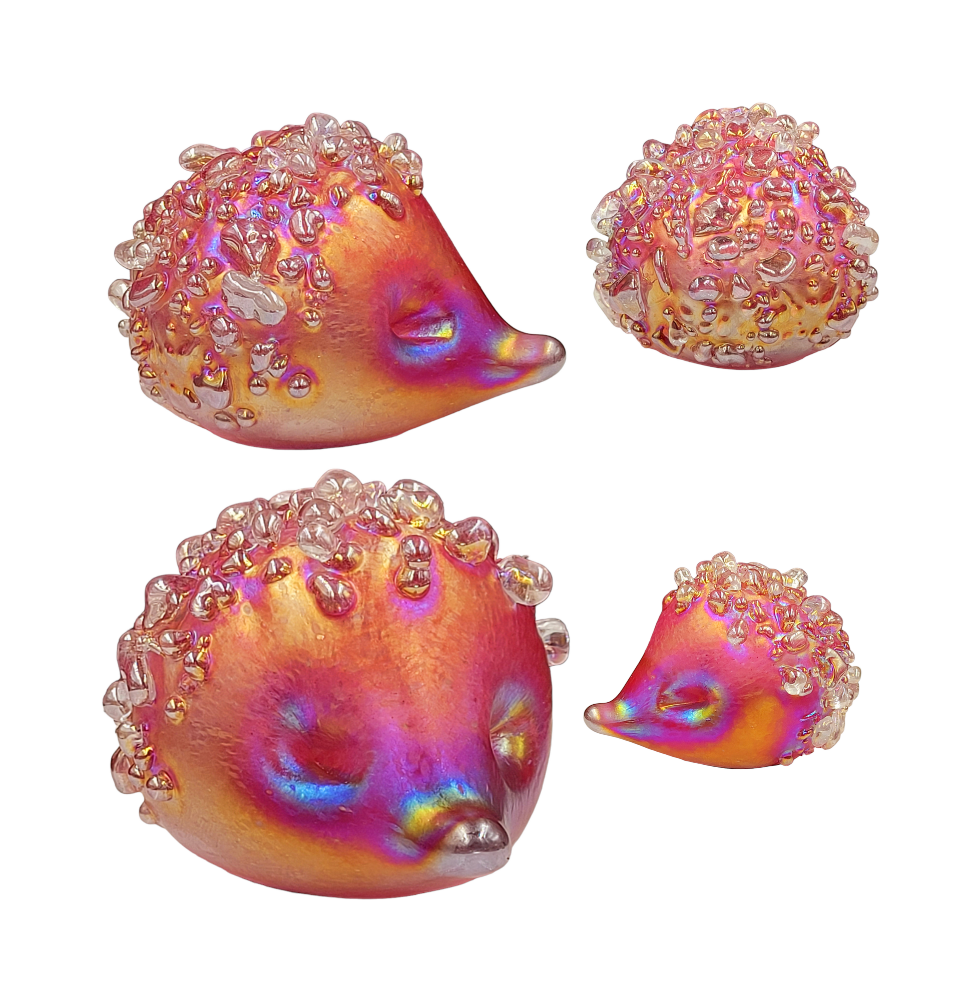 Introducing our adorable handmade glass hedgehogs! Crafted with love, these little cuties come in a variety of vibrant colours and are coated with a mesmerizing iridescent glaze. With a soft felt pad base, they make the perfect desk companion, a delightful gift, or a charming addition to any collection