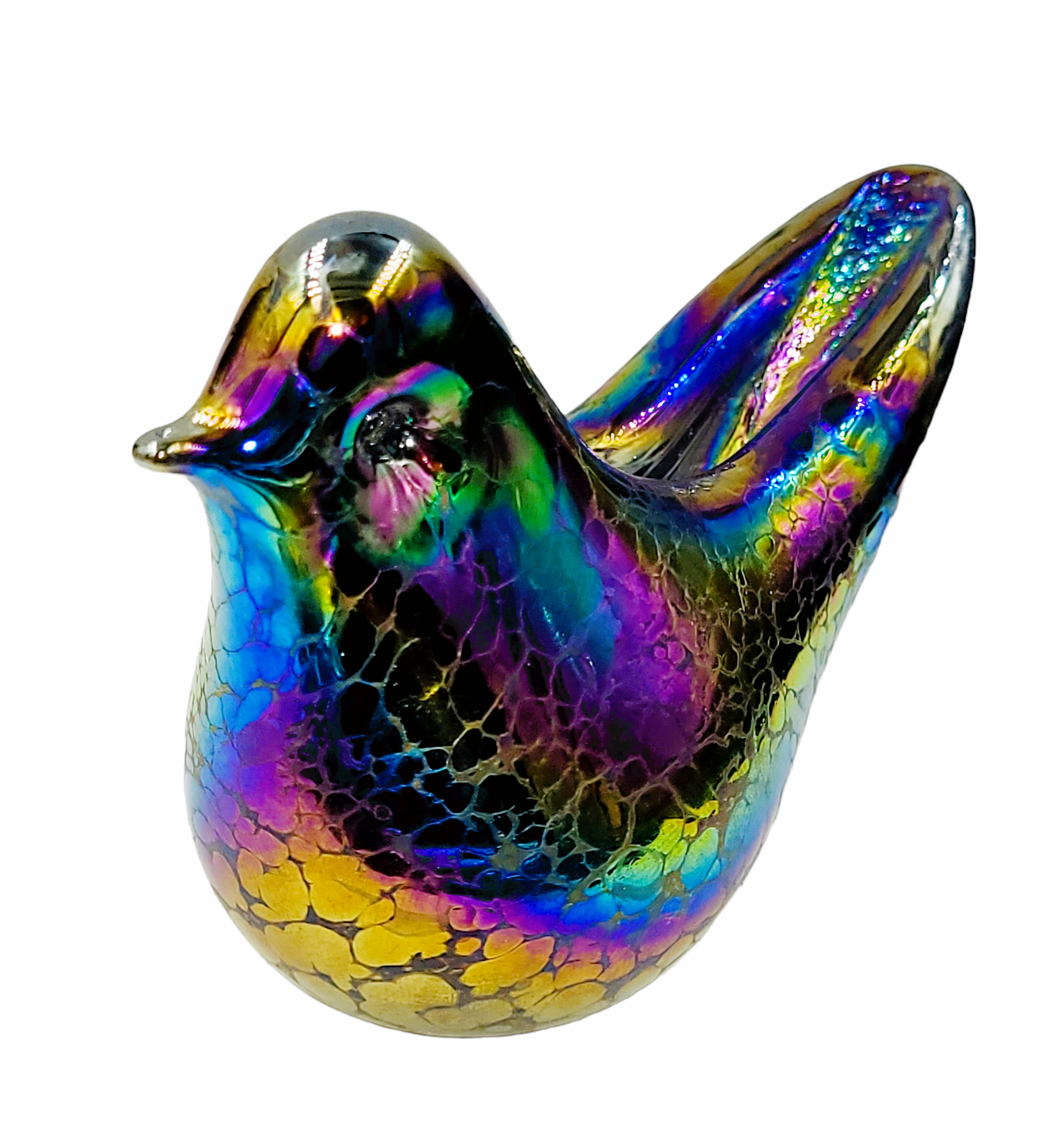 Handmade iridescent art glass bird paperweights in rainbow iridescent