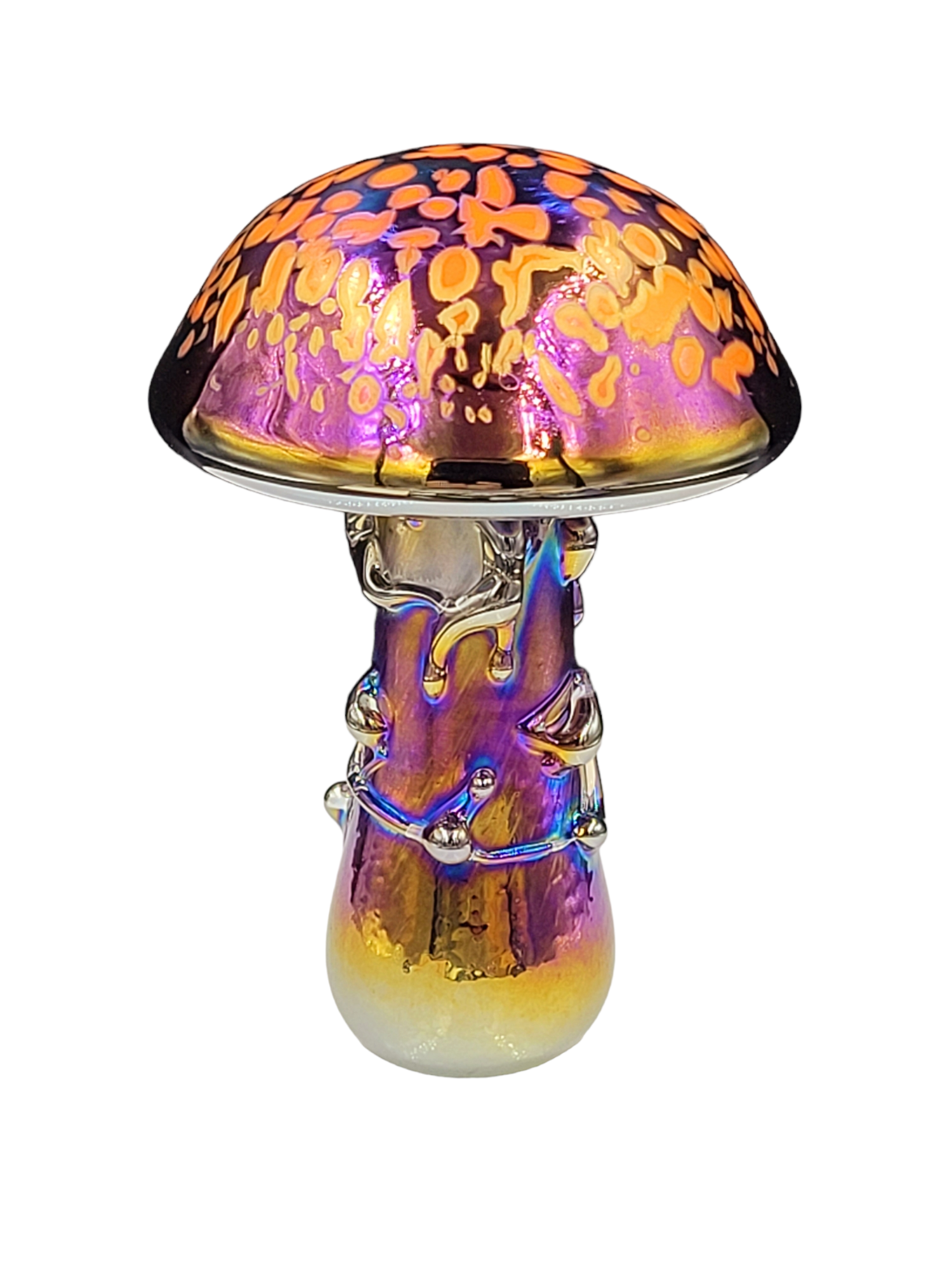 Handmade iridescent art glass mushrooms with orange speckled cap