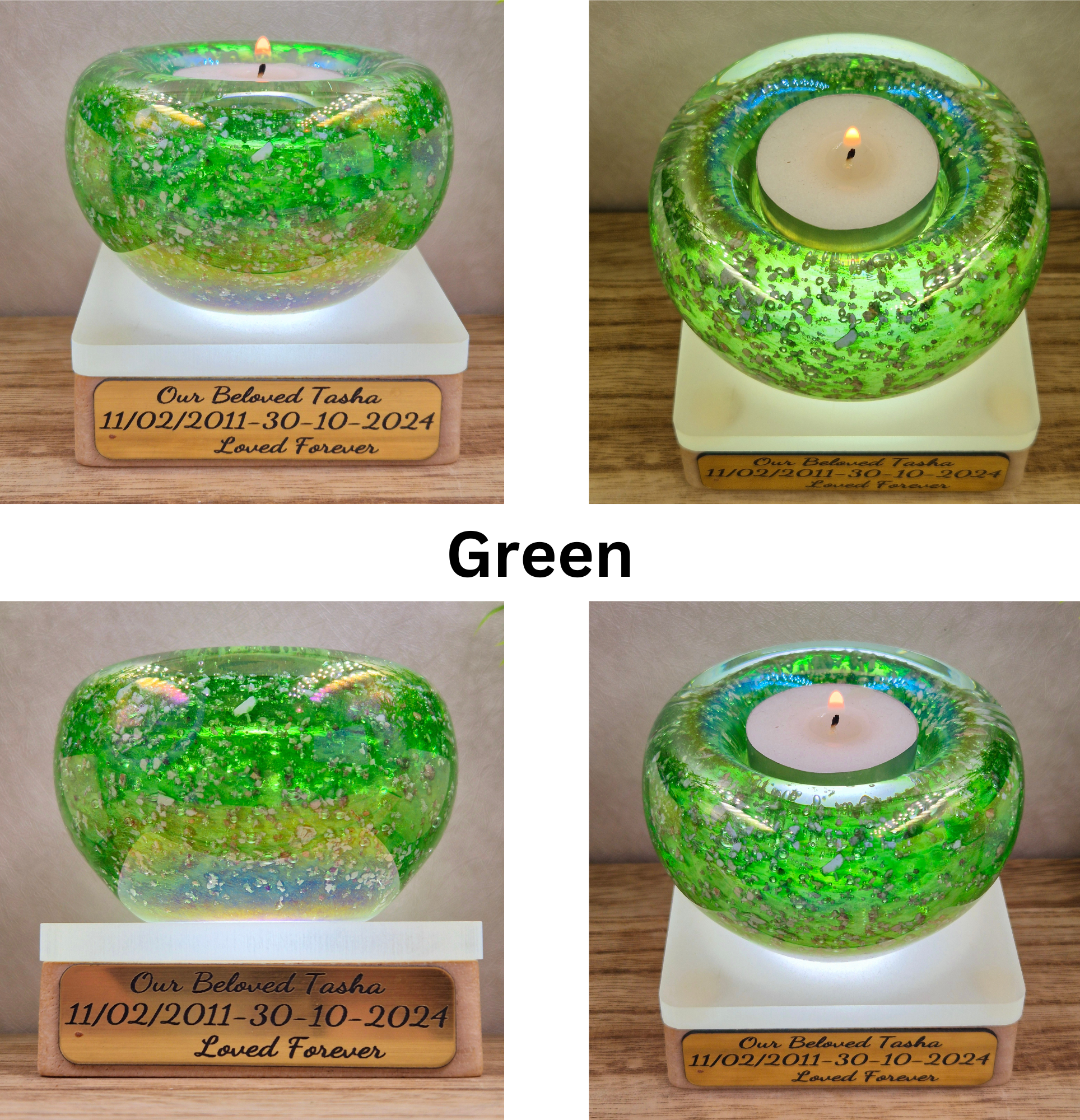 This handcrafted cremation ashes tealight holder is a beautiful sympathy gift that preserves the memory of a loved one or pet. The ashes are carefully fused into the glass, creating a unique and lasting tribute.
