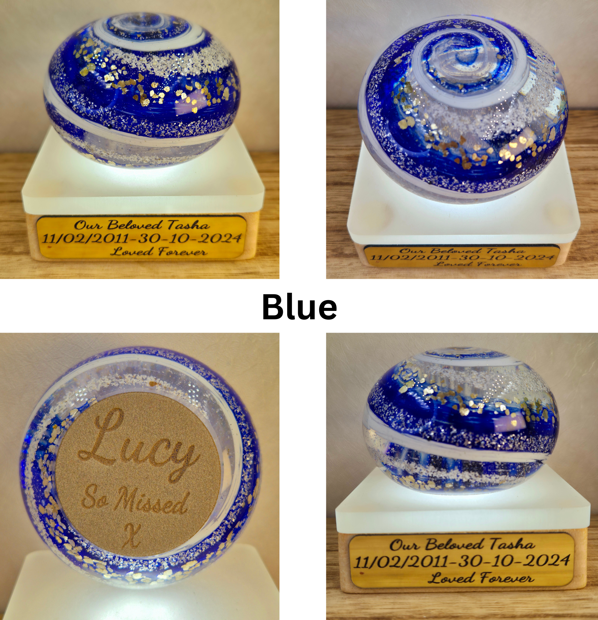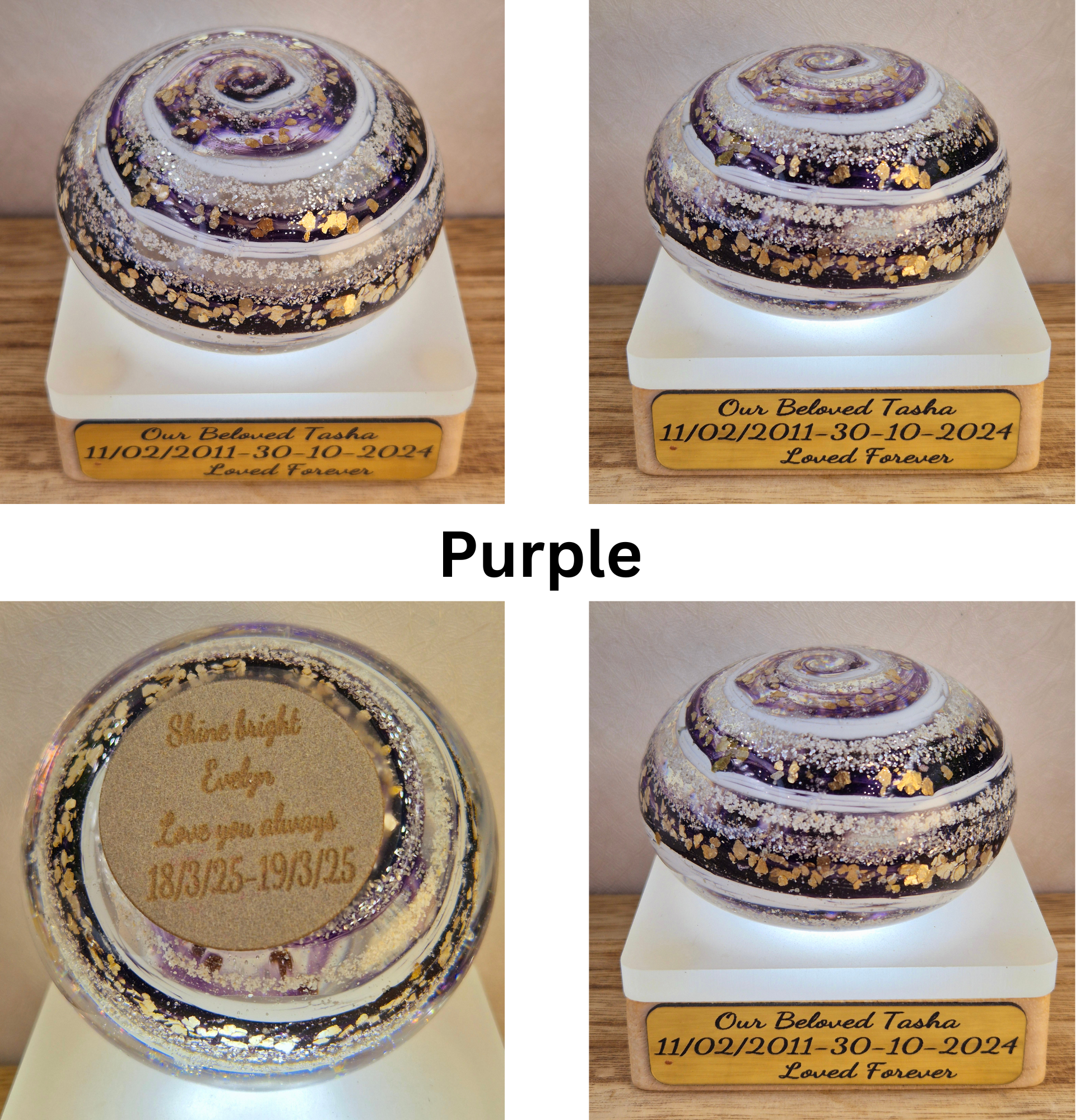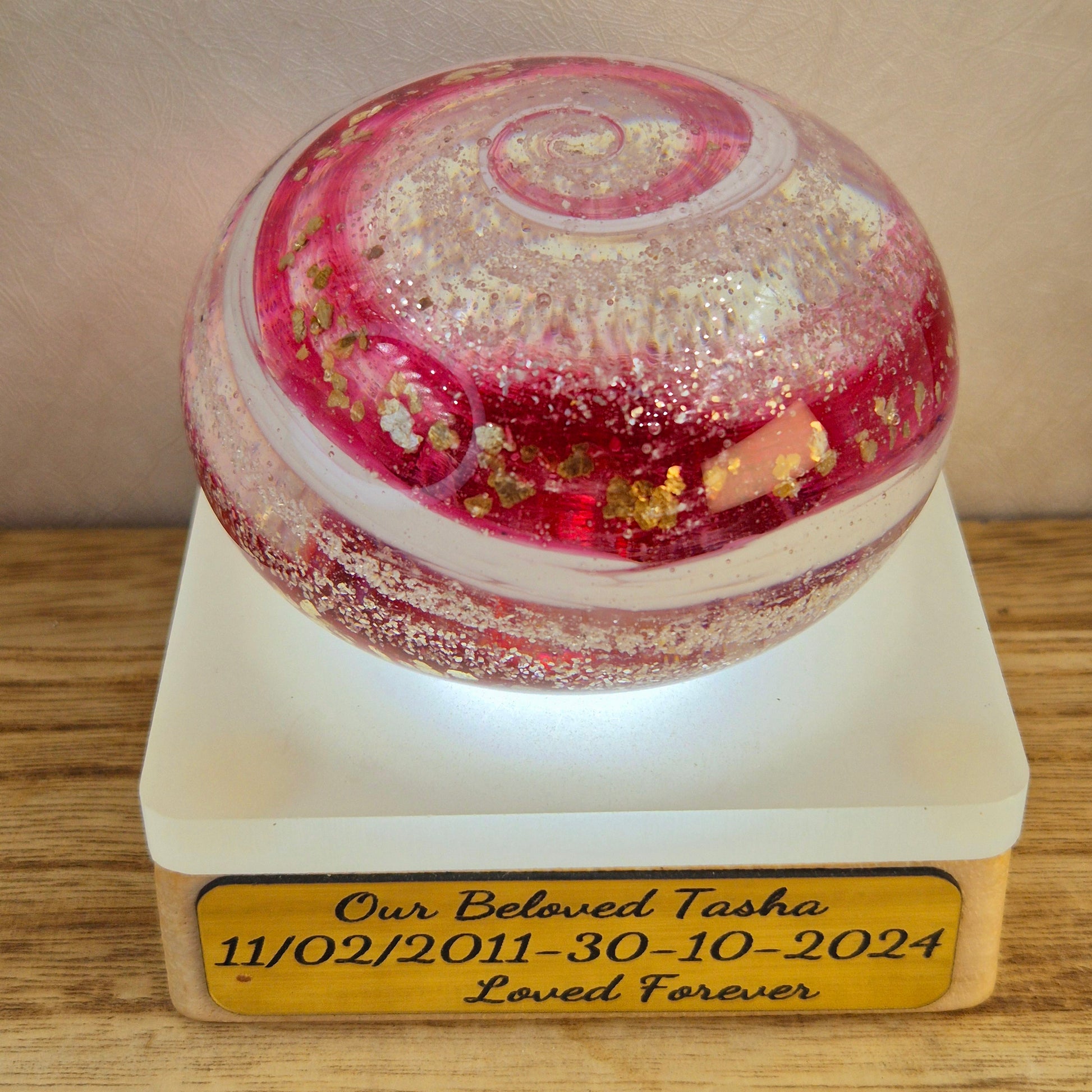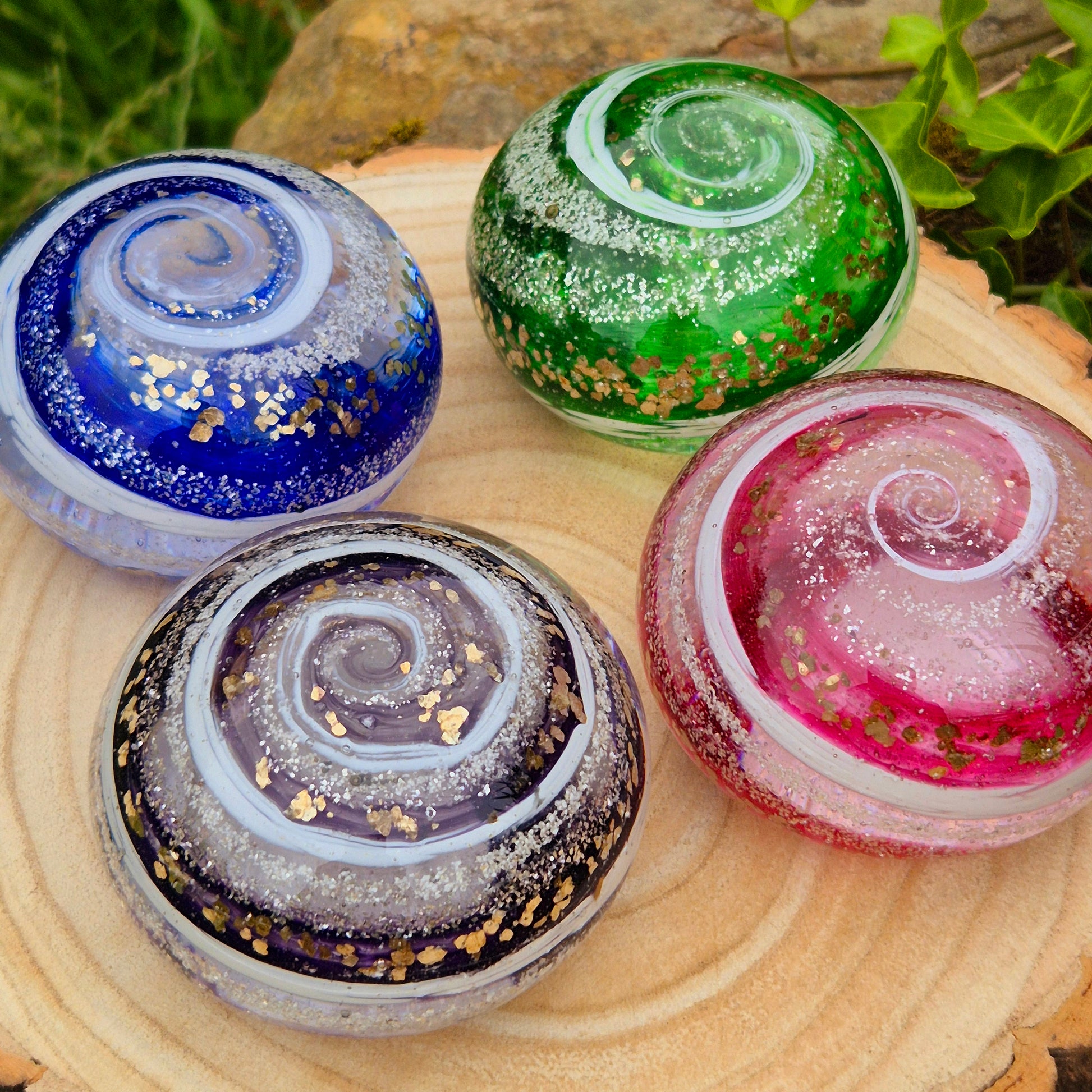 This handcrafted memorial glass paperweight offers a beautiful and lasting tribute to a loved one. Formed in an elegant pebble shape, it features a graceful spiral design infused with delicate crushed silver and gold leaf, creating a shimmering, celestial effect that catches the light from every angle.
