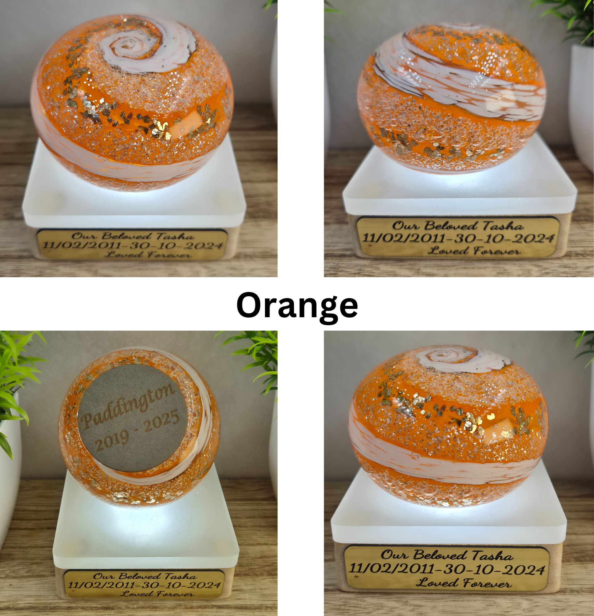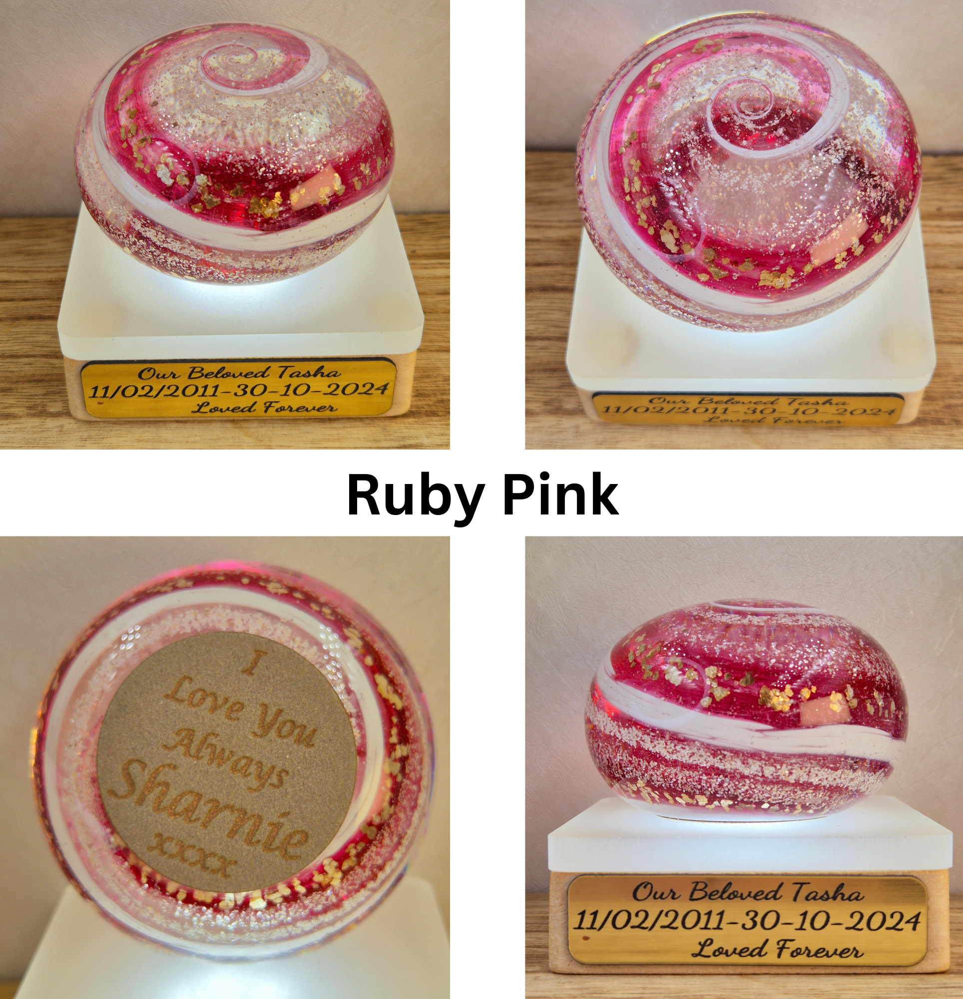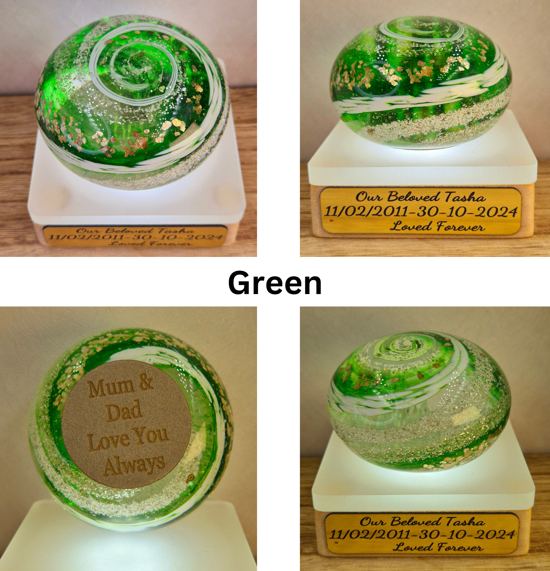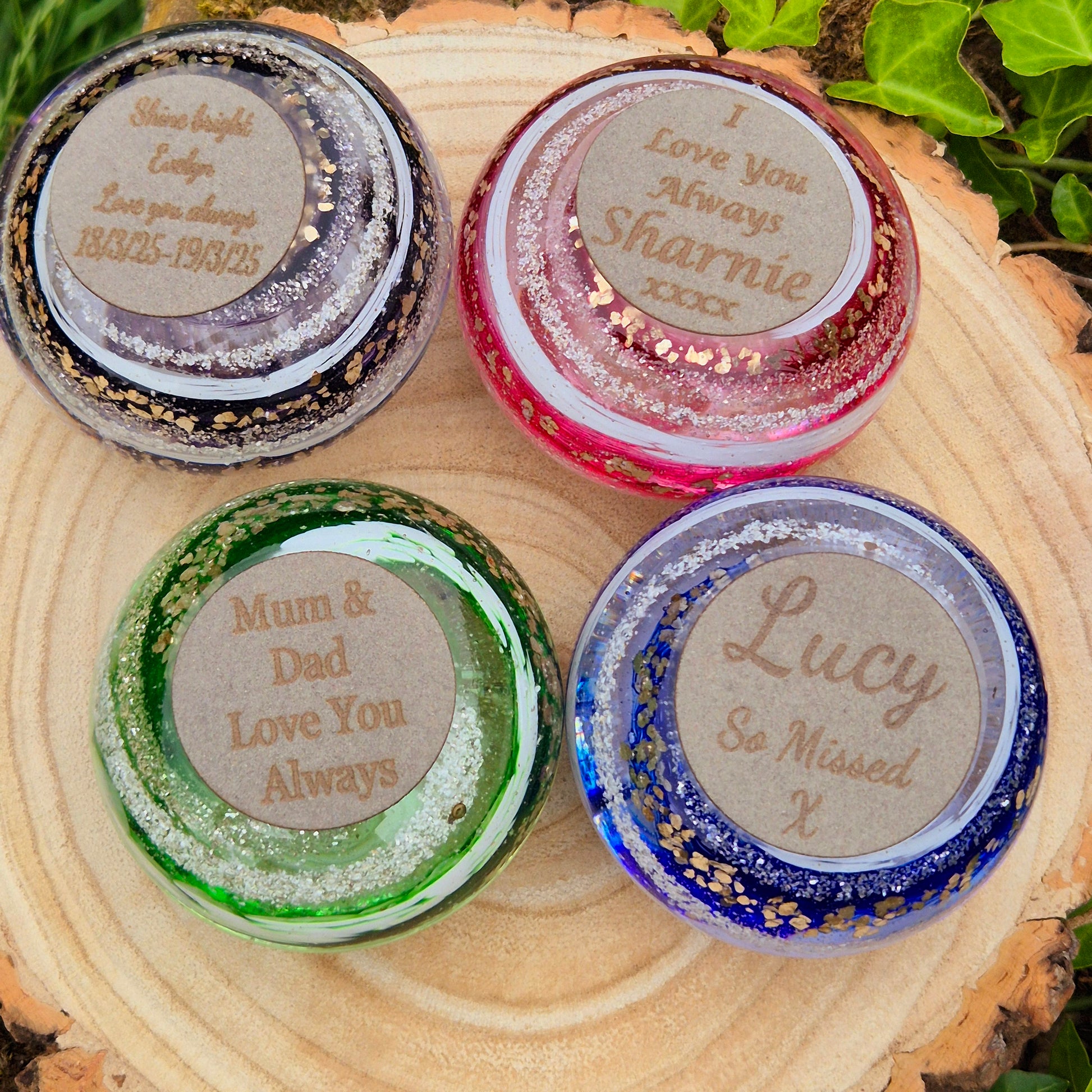 This handcrafted memorial glass paperweight offers a beautiful and lasting tribute to a loved one. Formed in an elegant pebble shape, it features a graceful spiral design infused with delicate crushed silver and gold leaf, creating a shimmering, celestial effect that catches the light from every angle.