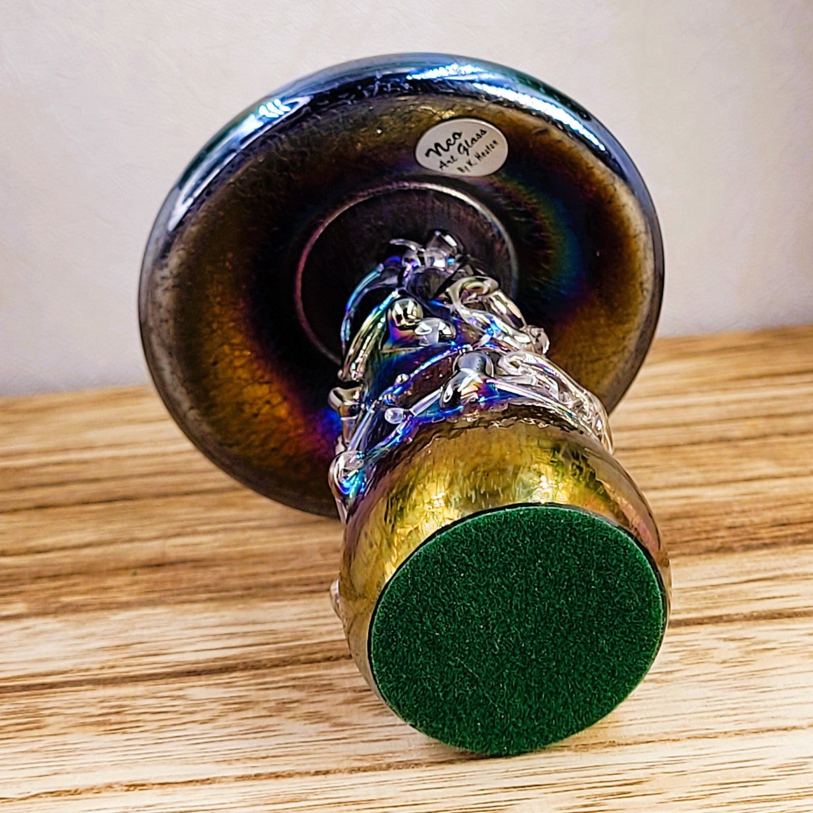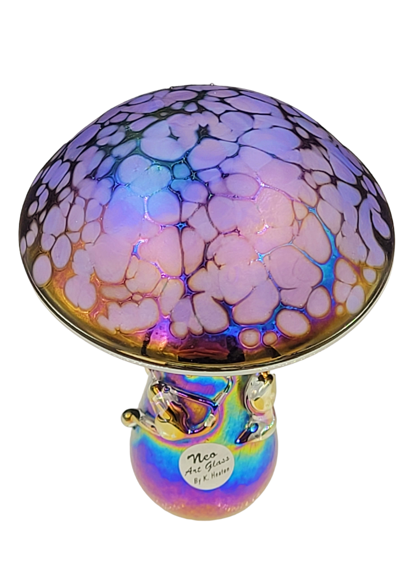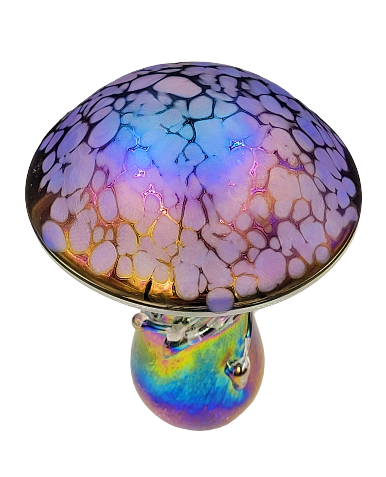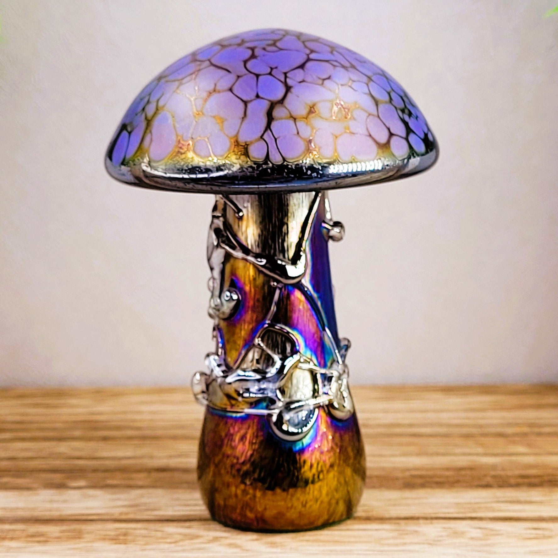 Handmade iridescent art glass mushrooms with purple speckled cap