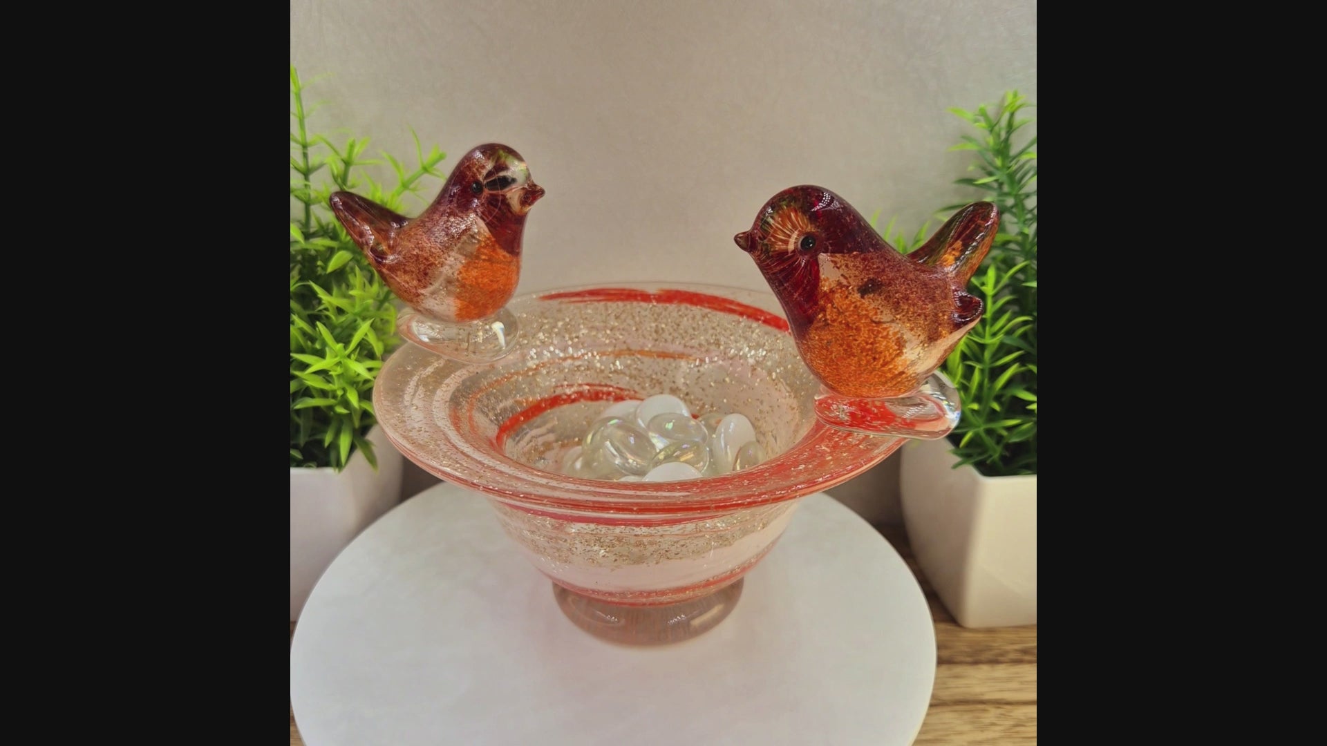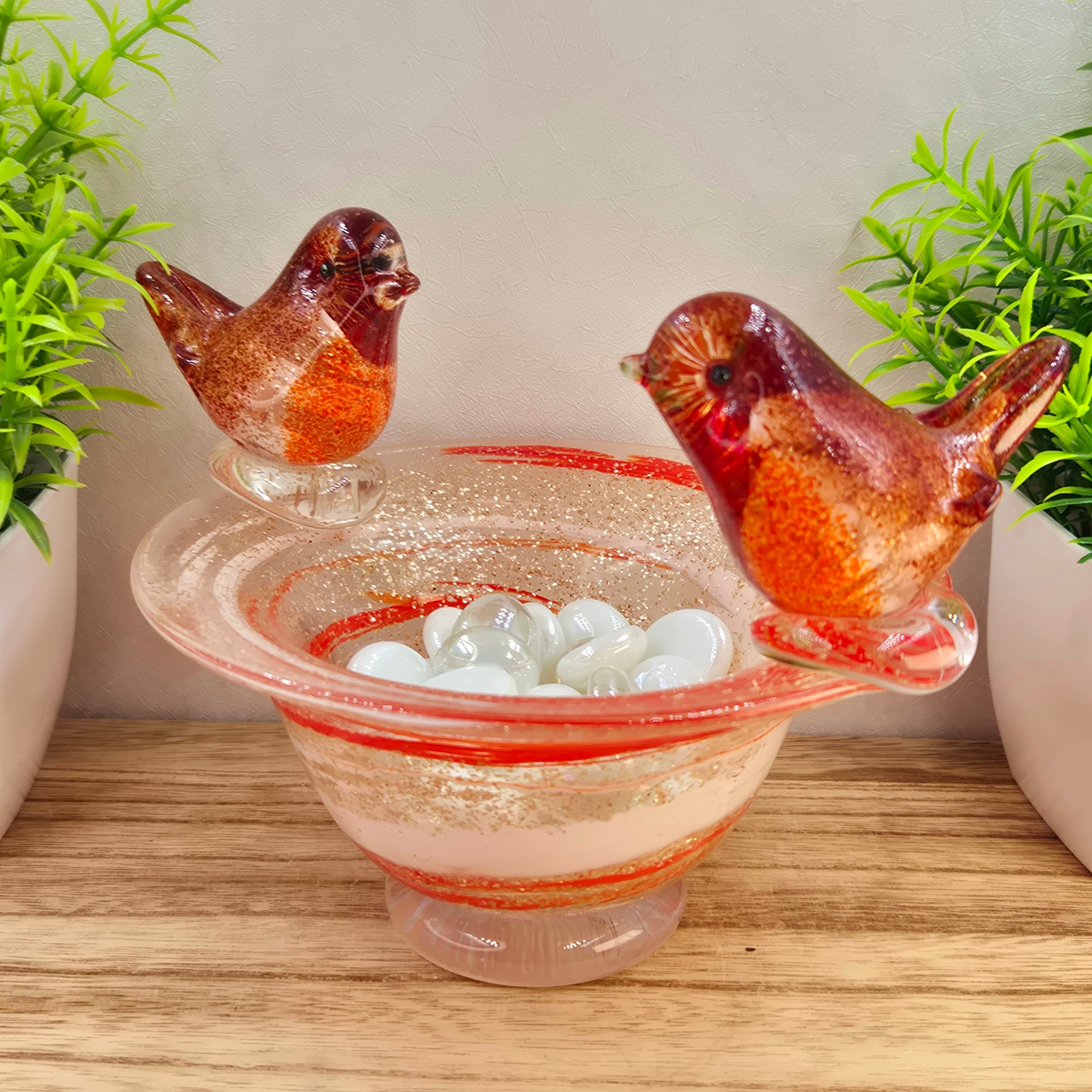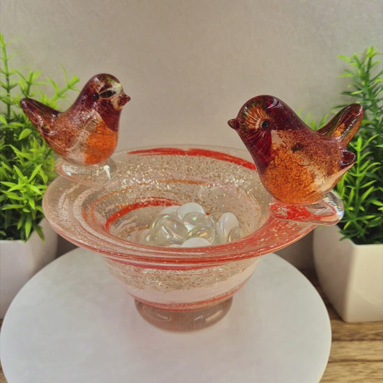 Gently honour the memory of your cherished one with this exquisite, handmade glass bowl featuring two beautifully detailed robin redbreast birds perched lovingly on the rim. Robins are a beloved symbol of comfort, hope, and the gentle reminder that loved ones are never truly far away – a heartfelt way to keep their presence close.